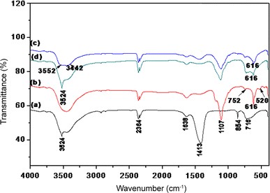 Fig. 5 FTIR spectra of (1-x)CdO-xSnO2 nanocomposites for x = 0 a, x = 0.05 b, x = 0.10 c, x = 0.15 d