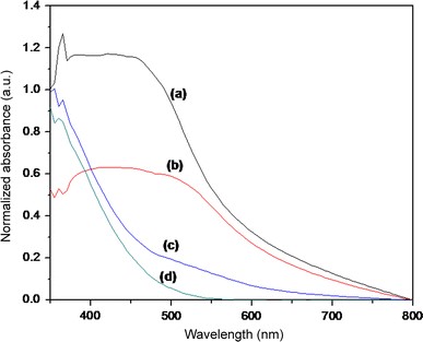 Fig. 6 Normalized absorption spectra of (1-x)CdO-xSnO2 nanocomposites for x = 0 a, x = 0.05 b, x = 0.10 c, x = 0.15 d