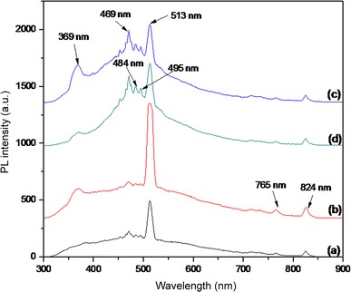 The photoluminescence spectroscopy (PL) was used to study the optical emission properties of (1-x)CdO-xSnO2 nanocomposites for x = 0, 0.05, 0.10 and 0.15. The PL spectra of (1-x)CdO-xSnO2 nanocomposites were recorded at an excited wavelength of 300 nm at room temperature. The PL spectrum of pure CdO shown in Fig. 8a reveals that the maximum strong emission occurs at ~ 513 nm which attributes to green emission spectrum at band gap of 2.4 eV comparable to near-band-edge emission of CdO nanostructures. Yang et al. [31] and Rajesh et al. [32] reported similar PL emission spectra. Such strong emission peak can be due to recombination of electrons in the conduction band and holes in the valence band. The PL spectra of (1-x)CdO-xSnO2 nanocomposites for x = 0.05, 0.10 and 0.15 shown in Fig. 8b-d depict significant effect on the photoluminescence intensities of the nanocomposites with the coupling of SnO2 and CdO nanostructures. It is clearly evident that as the concentration of SnO2 is increased, the peak intensity firstly increases and then subsequently decreases. At the same time, some additional PL peaks at ~ 369, ~ 469, ~ 485 and ~ 495 nm were also observed in CdO-SnO2 nanocomposites. Tan et al. [27] observed similar emission peaks for SnO2 nanostructures synthesized by hydrothermal method. Two more small intensity peaks at 765 and 824 nm were also observed which may arise due to the defects occurred in the nanocomposites during the growth.