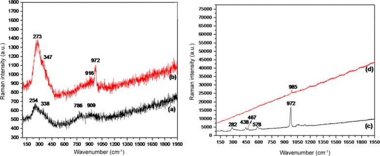 Fig. 9 Raman spectra of (1-x)CdO-xSnO2 nanocomposites for x = 0 a, x = 0.05 b, x = 0.10 c, x = 0.15 d
