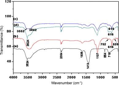 FTIR was used to determine the chemical bonding and functional groups in CdO and CdO-SnO2 nanostructures in the wave number range of 400-4000 cm-1. Figure 5a shows the FTIR spectrum of pure CdO nanostructure with the bands at ~ 3524, ~ 2364, ~ 1638, ~ 1413, ~ 854 and ~ 716 cm-1. The broad absorption band at ~ 3524 cm-1 can be attributed to the O-H stretching vibration of H2O on the surface of CdO, and the band at ~ 2364 cm-1 can be assigned to anti-symmetric stretching vibration of CO2 band [24]. The band located at ~ 1638 cm-1 is assigned to the H2O bending mode [17]. The OH/H2O functional group presents in the system may be due to atmospheric water vapours [20]. The broadbands located at ~ 1413, ~ 1107, ~ 854 and ~ 716 cm-1 observed as CdO stretching modes [17]. The FTIR spectra of (1-x)CdO-xSnO2 nanocomposites for x = 0.05, 0.10 and 0.15 as shown in Fig. 5b-d present the additional bands at ~ 616 and ~ 520 cm-1. The band at ~ 616 cm-1 can be assigned to the anti-symmetric O-Sn-O stretching mode of SnO2, and band at ~ 520 cm-1 is due to terminal oxygen vibration in SnO2 nanostructures. Seema et al. [25], Kumar et al. [26], Tan et al. [27] and Kumar et al. [28] also demonstrated similar stretching vibrations in SnO2 nanostructures. Therefore, the presence of characteristics bands of CdO and SnO2 in CdO-SnO2 nanocomposites clearly indicates the incorporation of SnO2 nanostructures in the CdO nanostructures. The slight shift of the bands located at 3524 to 3442 cm-1 and broadening of the band from 3442 to 3552 cm-1 are the evidences of the physical interactions between the CdO and SnO2 nanostructures.