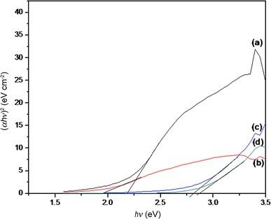 where α is the absorption coefficient, B is the constant, hv is the incident energy of photon, Eg is the band gap energy and n is an index that may have a value 2, 3, 1/2 and 1/3, depending on band-to-band transition. The optical energy band gap of pure CdO nanostructure is found to be 2.21 eV as shown in Fig. 7a, and the band gap energies of (1-x)CdO-xSnO2 nanocomposites for x = 0.05, 0.10 and 0.15 are 1.96, 2.80 and 2.87 eV, respectively, as depicted in Fig. 7b-d and presented in Table 2. It is evident from the analysis that the energy band gap of CdO-SnO2 nanocomposites can be tuned by controlling the concentration of SnO2 in the nanocomposite and therefore may have potential application in electronic devices.