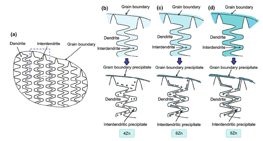 Fig. 11 Schematic diagrams of precipitation of secondary phases in Mg-Zn-Y-Nd alloy with different Zn contents: a morphology of grain and dendrite; element segregation and secondary phase precipitation at the grain boundary and interdendritic regions in 4Zn b, 6Zn c, 8Zn d alloys (b-d shows the magnification of the area with blue-dashed box in a)