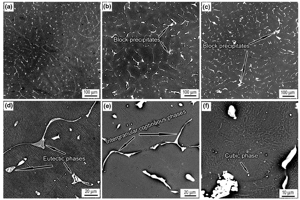 Further SEM observations shown in Fig. 2d-f revealed that most of the secondary phases in the grain interior exhibit eutectic morphology with a size of 5-20 μm and only small amount of block precipitates appear in the Mg-4Zn-1.2Y-0.8Nd alloy. With the increase in Zn content, large block precipitates increase, as shown in Fig. 2b and c. In addition, some dispersive cubic phases with a size of about 1 μm are observed in the alloy, as shown in Fig. 2f.