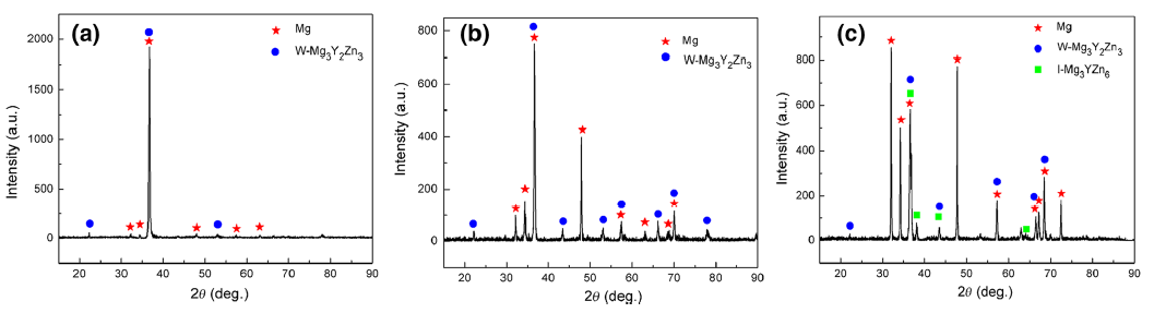 Figure 2 shows the microstructures of three as-cast Mg-Zn-Y-Nd alloys with different Zn additions. Clearly, the as-cast alloy specimens are composed of α-Mg matrix and secondary phases. By comparing SEM images of three alloys with different Zn contents in Fig. 2a-c, it can be seen that with the increase in Zn content, the content of secondary phase increases. The volume fraction of secondary phases was measured by image analysis software, and the results indicate that the volume fractions of secondary phases in these alloys with Zn contents of 4, 6, and 8% are 3.77, 5.18, and 6.70%, respectively. In the Mg-4Zn-1.2Y-0.8Nd alloy, the secondary phases at the grain boundary are continuous long strip and eutectic morphology, and the secondary phases in the grain interior are granular and rod-like morphology. As the Zn content increases to 6 and 8%, the grain boundary secondary phases become thicker, and the secondary phases in the grain interior become continuous and large block morphology.