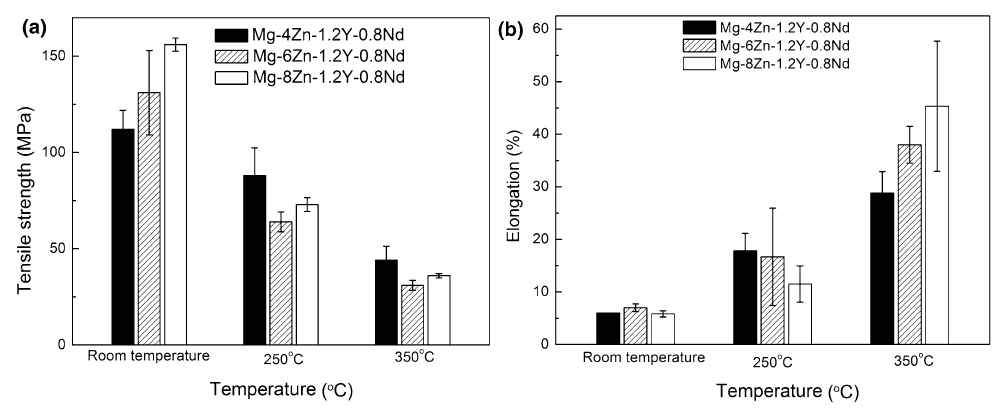 Fig. 7 Tensile test results of Mg-Zn-Y-Nd alloys with different Zn contents: a tensile strength; b elongation