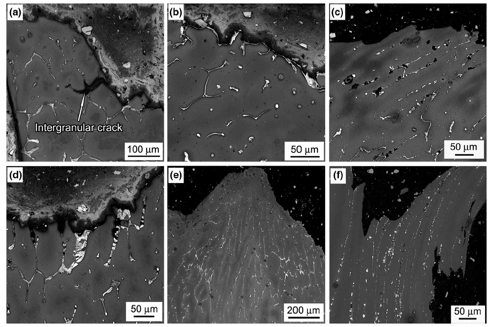 The longitudinal section of the fractured specimens was observed to study the crack propagation path, and the typical results are exhibited in Fig. 9. It can be found from Fig. 9a, b, and c that the microcracks of Mg-Zn-Y-Nd alloys at room temperature propagate along the continuous precipitates. At 250 °C, the large eutectic and block phases near the fracture break and become microcrack initiation sites. Then, the microcracks propagate along continuous precipitates and lead to the final fracture, as shown in Fig. 9c, d. The longitudinal sections of tensile fractures tested at 350 °C are shown in Fig. 9e and f. The fluctuation of fracture surfaces are significantly. The α-Mg grains are elongated along the applied stress direction. The secondary phases break and distribute along the applied stress direction. As Zn content increases, the elongation extent of the α-Mg grain increases, and the broken secondary phases are more inclined to distribute parallelly to the applied stress direction, as demonstrated in Fig. 9f.
