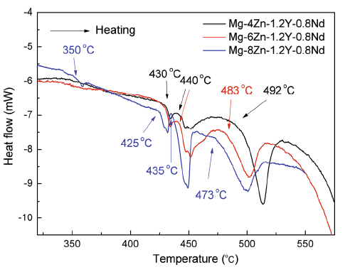The DSC curves of Mg-Zn-Y-Nd alloys with different Zn contents are shown in Fig. 10. It can be seen that the peaks of the three alloys are similar during the heating process except for the extra endothermic peak at 350 °C for 8Zn alloy. The endothermic peaks can be expected to correspond to the melting of some compounds. The small peaks of 4Zn and 6Zn alloys at about 430 °C and 8Zn alloy at about 425 °C can be regarded as the melting of W′-phase phase. Geng et al. [30] has obtained the DSC curve of Mg63.5Zn34Y2.5 alloy and found that I-phase begin to decompose or melt at about 435 °C. Thus, in the present research, the peaks of 4Zn and 6Zn alloy at about 440 °C and of 8Zn alloy at 435 °C could be considered as the melting of I-phase. The last peaks, which are the largest peaks of the three alloys, appear at 492, 483, and 473 °C for the 4Zn, 6Zn, and 8Zn alloys, respectively. The investigation of Li in an as-cast Mg-Zn-Zr alloy shows that the endothermic peak of W-phase in the DSC curve initially appears at 490 °C [31]. Thus the last peaks of the present DSC curves can be referred as the melting of W-phase. Besides, the extra peak at 350 °C of 8Zn alloy may be the melting of Mg7Zn3, as in the previous study [32]. However, the Mg7Zn3 phase is metastable, and thus it would resolve in the matrix during the following solidification process.