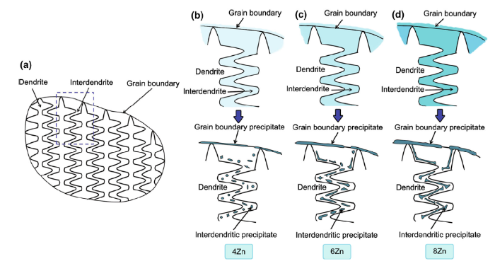 Moreover, to express the effect of Zn content on the microstructure of the as-cast Mg-Zn-Y-Nd alloy, a schematic diagram is shown in Fig. 11. The microstructure of the as-cast Mg-Zn-Y-Nd alloy consists of grains and dendrites, as in Fig. 11a. As the secondary phases are formed mainly in the interdendritic region and along the grain boundary, the area with blue-dashed box in Fig. 11a is magnified to reveal the element segregation and secondary phase precipitation process during solidification, as shown in Fig. 11b-d. During solidification, the alloying elements tend to be expelled to the interdendrite and grain boundary areas which are the final solidification zones [33]. In Fig. 11b-d, the blue color at the interdendrite and grain boundary areas represents the element segregation. As Zn content increases, the blue color becomes darker and darker, which means the increase in the element segregated at the interdendrite and grain boundary areas. For 4Zn alloy, the Zn segregated at the interdendrite and grain boundary areas are low, and thus the continuous secondary phases formed at the grain boundary are thin, and the interdendritic secondary phases are small granular and rod-like shape, as indicated in Fig. 11b. While for the 6Zn and 8Zn alloy, as shown in Fig. 11c and d, the Zn segregated at the interdendrite and grain boundary areas increases, and therefore the continuous secondary phases formed at the grain boundary become thicker, and the secondary phases formed in the interdendritic area become larger and continuous. Especially for the Mg-8Zn-1.2Y-0.8Nd alloy, the secondary phases present as skeleton shape along the interdendritic area.