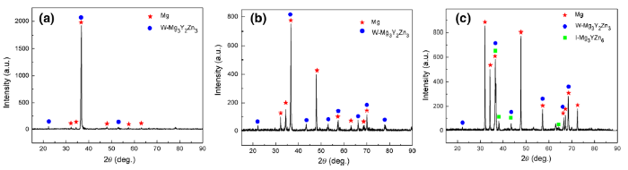 Fig. 3 XRD patterns of as-cast Mg-4Zn-1.2Y-0.8Nd a, Mg-6Zn-1.2Y-0.8Nd b, Mg-8Zn-1.2Y-0.8Nd c