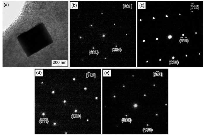 Fig. 5 Bright-field TEM image a, selected area electronic diffraction (SAED) patterns b-e of cubic phase in as-cast Mg-6Zn-1.2Y-0.8Nd alloy