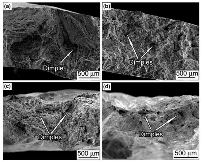 Fig. 8 SEM images of fracture surfaces of specimens after tensile test at different temperatures: a Mg-4Zn-1.2Y-0.8Nd alloy at room temperature; b Mg-8Zn-1.2Y-0.8Nd alloy at room temperature; c Mg-6Zn-1.2Y-0.8Nd alloy at 250 °C; d Mg-8Zn-1.2Y-0.8Nd alloy at 350 °C