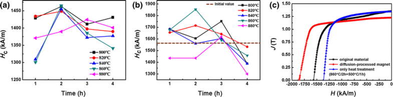 Fig. 2 a Coercivity values at 27 °C of the reference magnets exposed only to heat treatment without Dy-Cu diffusion, b Coercivity values at 27 °C of the GBDPed magnets under different heat treatment states, c demagnetization curves at 27 °C for the original magnet, diffusion-processed magnet using Dy70Cu30 alloy and the magnet only heat-treated at 860 °C/2 h + 500 °C/1 h without Dy-Cu diffusion