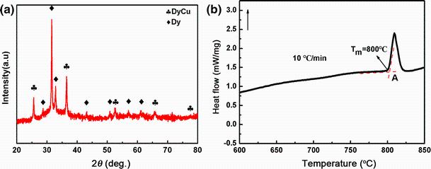 Dy70Cu30 alloy was selected as the diffusion source in this study. The introduction of Dy enhances the magnetocrystalline anisotropy of the Nd2Fe14B compound in the extensive layers of the Nd2Fe14B grains where magnetization reversal starts. Cu in the intergranular phase can contribute to the improvement in wettability between intergranular phase and matrix phase. Dy70Cu30 is a eutectic alloy consisting of two phases, intermetallic DyCu and solid solution β-Dy, at room temperature. Figure 1a shows XRD pattern of the Dy70Cu30 alloy ribbons prepared in this study. Peaks corresponding to two phases (intermetallic DyCu and solid solution β-Dy) are observed. Figure 1b shows the DSC curve of the Dy70Cu30 alloy ribbons, showing the melting temperature of eutectic mixture at 800 °C.