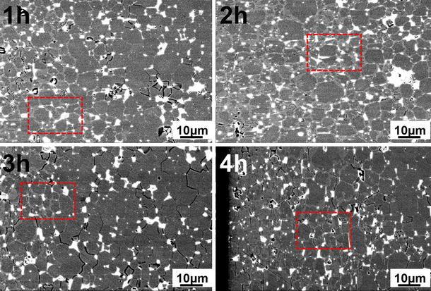 In order to investigate quantitatively the concentration distribution of Dy during the GBDP, three points of the Dy-rich shell phase and the Nd2Fe14B phase were analyzed by EDS, respectively, in the marked square regions in Fig. 4, and then, the mean value of each sample was calculated (shown in Fig. 5). The concentration of Dy in the region where the core-shell structure nearly disappeared can be used to analyze the mechanism for the reduction in depth of the core-shell structure in GBDPed magnets heat-treated at 860 °C for 3 and 4 h. It can be observed from Fig. 5 that the content of Dy in Dy-rich shell phase reached the peak at 2 h and then dropped down with the increase in heat treatment time. In contrast, the content of Dy in Nd2Fe14B grains maintained steady at the time of 1-3 h and increased at 4 h.