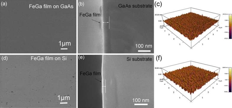 Fig. 1 Typical SEM images of FeGa film on GaAs and Si, respectively. a Surface topography on GaAs; b cross-sectional image on GaAs; c AFM 3D image; d surface topography on Si, e cross-sectional image on Si; f AFM 3D image