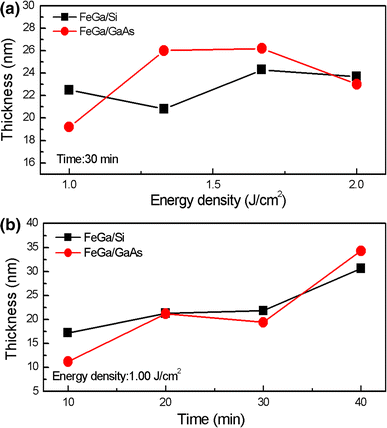 Fig. 2 Thicknesses of FeGa thin film on GaAs and Si substrate with different deposition time and laser energy densities
