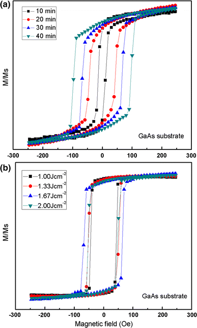 The hysteresis loops of FeGa film under different deposition time and laser energy densities on GaAs substrate, which are measured in an in-plane external magnetic field, are shown in Fig. 4. The soft magnetic properties could be observed in all the samples under different deposition time. The coercivity of FeGa film increases with the deposition time. The maximum and the minimum coercivities of FeGa film are 97 and 12 Oe when the deposition time is 40 and 10 min, respectively. The remanence ratio Mr/Ms of FeGa film on GaAs substrate is from 0.90 to 0.7 along with the increase in deposition time, as shown in Fig. 4a. Obviously, with increasing the deposition time, the magnetic coercivity and the remanence ratio both turn large. The thickness of the film increases linearly with the deposition time (Fig. 2). The change in magnetic properties could be attributed to the formation of nanocrystalline or amorphous during the film growth [21, 22], especially when the deposition time is short. Because of an instantaneous high-temperature process of PLD, a mixture phase of A2, D03 could be induced, which is like arc-melted fabrication. With the emergence and enhancement of D03 phase, the hysteresis loops of FeGa film have a bigger coercivity and a better squareness ratio, which means that the FeGa film has a larger magnetocrystalline anisotropy. These results are well compliant with the XRD data.