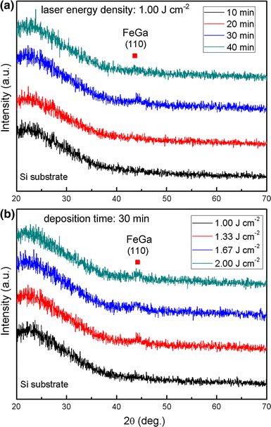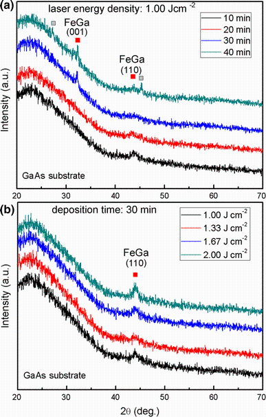Figure 5a, b shows the X-ray diffraction patterns of the FeGa thin films deposited on Si substrate at different deposition time and laser energy density, respectively. Compared with Fig. 3, FeGa film deposited on Si substrate shows obvious amorphous property. Rather than the FeGa film deposited on the GaAs substrate, the film on Si substrate does not show the (001)-directed D03-ordered grain phase. This is mainly due to the large lattice mismatch between Si and FeGa.