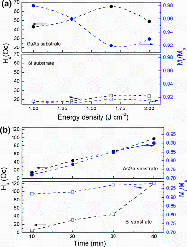 Fig. 7 Details of Hc and Mr/Ms of FeGa film fabricated on different substrates with the increase in energy density a deposition time b