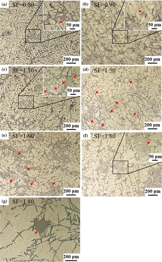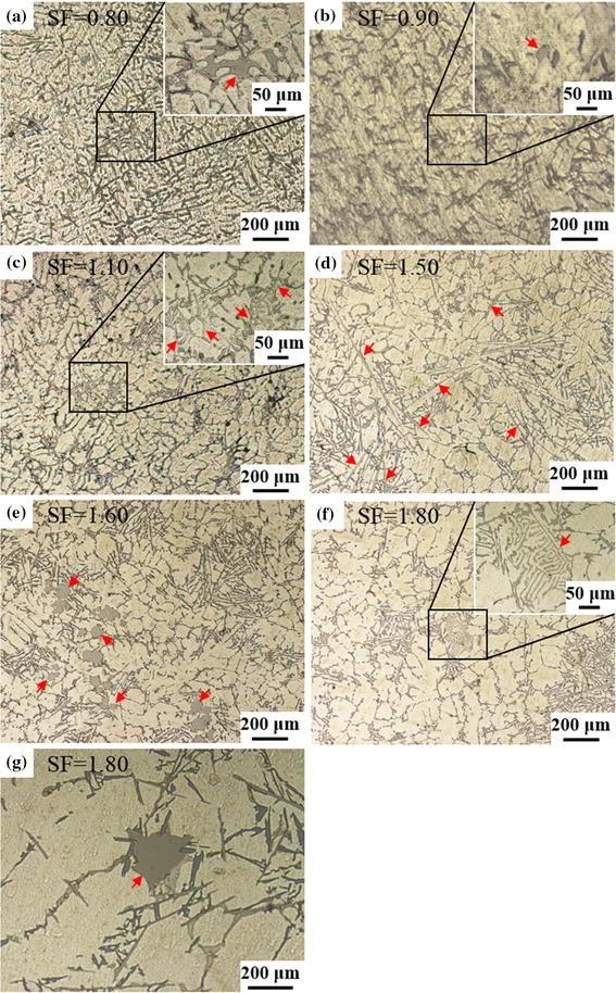 Fig. 1 OM images of AlSi9Cu3Mg0.19(Fe) alloys with 0.6 wt% Fe and a 0.1 wt% Mn, b 0.1 wt% Cr, c 0.1 wt% Mn, 0.1 wt% Cr; with 1.3 wt% Fe and d 0.1 wt% Mn, e 0.1 wt% Cr, f, g 0.1 wt% Mn, 0.1 wt% Cr. The red arrows in a-g show the coarse Chinese script, blocky, fine Chinese script, needle-like, hexagonal morphologies, fish-bone, and pentagonal morphologies of Fe-rich phases, respectively
