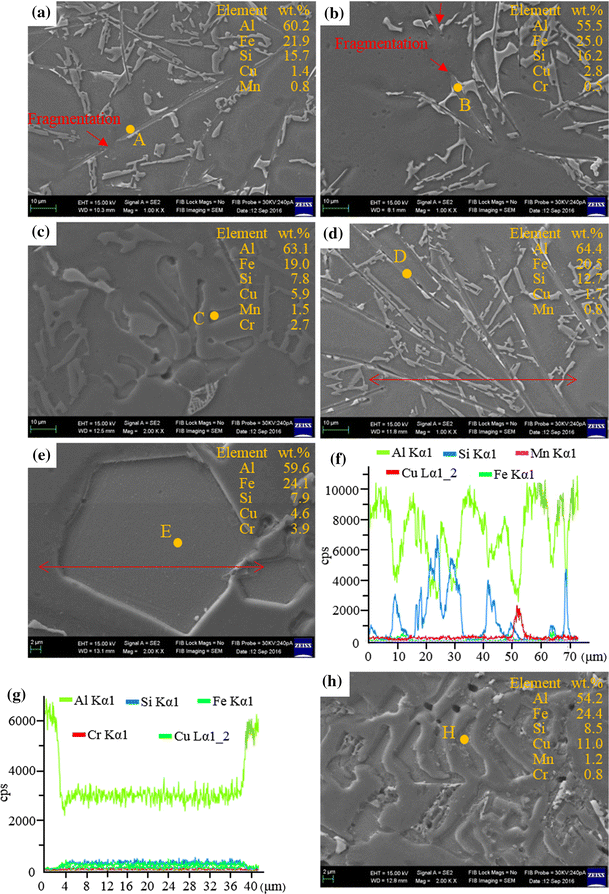 Figure 2f and g shows the linear scanning curves of elements on phases in the AlSi9Cu3Mg0.19(Fe) alloy (marked by the red arrows, Fig. 2d and e). And chemical composition profiles over the phases were recorded. As it is seen from Fig. 2f, the needle-like Fe-rich phases contain aluminum, iron, silicon, and manganese contents. And this kind of phase contains more iron content compared to the matrix of Al alloys. It was found that significant variations in the aluminum and silicon contents were observed over the needle-like iron-rich phases. The linear scanning curves in Fig. 2g suggest that the hexagonal Fe-rich phases contain aluminum, iron, silicon, and chromium contents. In addition, the level of these elements is kept mostly constant in the hexagonal Fe-rich phases, which indicates the homogeneous distribution of elements. It is worth noting that both needle-like Fe-rich phases and hexagonal Fe-rich phases contain less aluminum and more silicon contents compared to the Al matrix. That is to say, the increase in silicon content exists concurrently with the decrease in aluminum content in the two kinds of Fe-rich phases compared to the Al matrix. In conclusion,the addition of minor Mn and Cr could cause the alteration of chemical composition of iron-rich phases in the AlSi9Cu3Mg0.19(Fe) alloy.