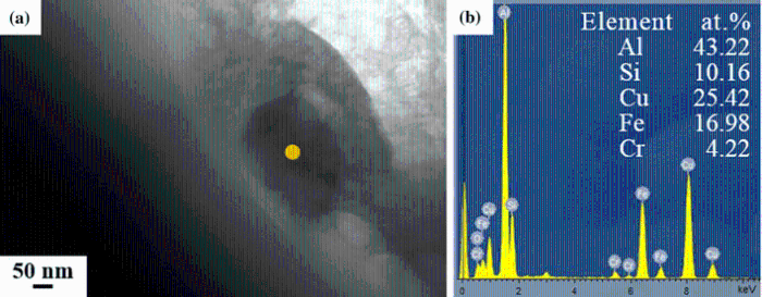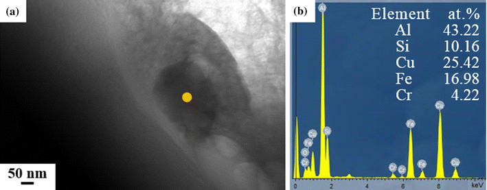 Figure 4 exhibits the TEM micrograph of the hexagonal Fe-rich phase in the Alloy 5 and its corresponding EDS results. The hexagonal Fe-rich phase exists in the Alloy 5 as shown in Fig. 4a. The corresponding EDS spectra indicate that this kind of phase contains Al, Si, Fe, Mn, and Cr contents (Fig. 4b). These results are consistent with the work of Wang et al. [13].