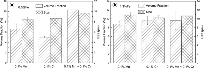 Figure 6 shows the volume fraction and size (length) of Fe-rich phases in the AlSi9Cu3Mg0.19(Fe) alloys, which were analyzed by image analysis software. At low Fe level, compared to the alloy with the trace addition of Mn or Cr, the volume fraction and size (length) of Fe-rich phases are larger (10.3%, 9.69 μm, respectively) in the alloy with the trace addition of both Mn and Cr, which are caused by the formation of Chinese script Fe-rich phases (Fig. 6a). At high Fe level (1.30 wt%), the volume fraction and size (length) of Fe-rich phases in the alloy with the trace addition of Cr are 9.7%, 10.23 μm, respectively, which are usually resulted from the formation of hexagonal Fe-rich phases (Fig. 6b). The combination of Mn and Cr could promote the formation of fish-bone Fe-rich phases, which leads to the larger volume fraction (9.6%, Fig. 6b). The volume fraction and size (length) of Fe-rich phases in the alloy with 1.30 wt% Fe and 0.10 wt% Mn are larger (8.8%, 10.91 μm, respectively) than that of alloy with 0.60 wt% Fe and 0.10 wt% Mn (6.6%, 8.5 μm, respectively). This is because many needle-like Fe-rich phases are observed in the alloy with 1.30 wt% Fe and 0.10 wt% Mn. A small amount of blocky Fe-rich phases appears in the alloy with 0.6 wt% Fe combined with trace Cr. This produces a smaller volume fraction and size (length) of Fe-rich phases (5%, 8.66 μm, respectively, Fig. 6a) compared to that of alloy with 1.30 wt% Fe combined with trace Cr. However, under the coexistence of trace Mn and Cr, the volume fraction and size (length) of Fe-rich phases have no great difference between the low iron-bearing (10.3%, 9.69 μm, respectively, Fig. 6a) and high Fe level AlSi9Cu3Mg0.19(Fe) alloy (9.6%, 10.7 μm, respectively, Fig. 6b).