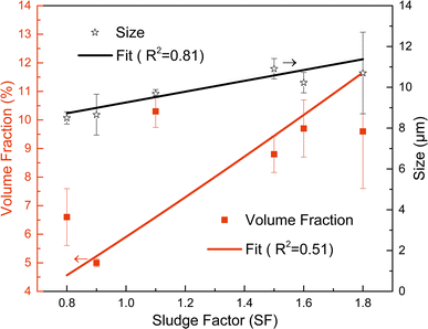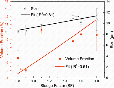 Fig. 7 Volume fraction and size (length) of Fe-rich phases in the AlSi9Cu3Mg0.19(Fe) alloy as function of the sludge factor
