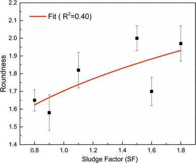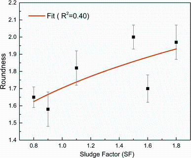 Fig. 8 Roundness of Fe-rich phases as function of the sludge factor in the AlSi9Cu3Mg0.19(Fe) alloy