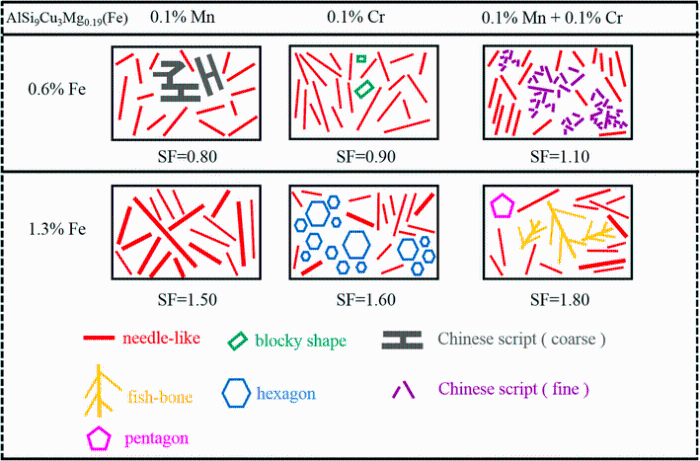 (1) The trace Mn promotes the formation of Fe-rich phases with coarse Chinese script morphologies by suppressing the development of needle-like iron-rich phases, whereas trace Cr benefits the formation of blocky or hexagonal Fe-rich phases. Most notably, the combination of Mn and Cr could promote the formation of fine Chinese script, fish-bone or pentagonal morphologies of Fe-rich phases.