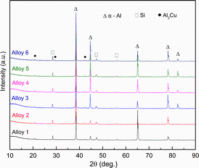 XRD analysis was carried out to confirm EDS results and to identify accurately the intermetallic phases in the cast samples (Fig. 5). However, there is mainly α-Al, Al-Si eutectic, and Al2Cu phases in all alloys. Meanwhile, no Fe-rich phases appear in all alloys.