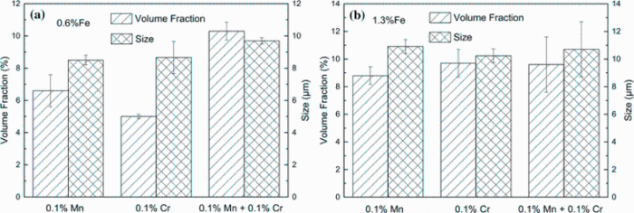 Besides the volume fraction, the size (length) of Fe-rich phases slightly increases as the iron or manganese content increases in alloys. At low Fe level, the size (length) of Fe-rich phases increases with the increase in Cr levels, while slightly decreases at high Fe level.