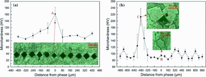 Figure 9 gives the microhardness profiles over the iron-rich phases in the AlSi9Cu3Mg0.19(Fe) alloy. As shown in Fig. 9a, the microhardness of the needle-like iron-rich phase (point A) is 161.6 HV, which is much higher than others. And the microhardness of the hexagonal iron-rich phase is 95.1 HV as shown in Fig. 9b (point B). Moreover, another hexagonal iron-rich phase displayed the maximum microhardness (212.8 HV, point C), which could be attributed to the chemical segregation. And this microhardness analysis is consistent with the aforementioned results. Therefore, the altered chemical composition profiles of iron-rich phase produce the change of microhardness profiles over the iron-rich phases in the AlSi9Cu3Mg0.19(Fe) alloy.