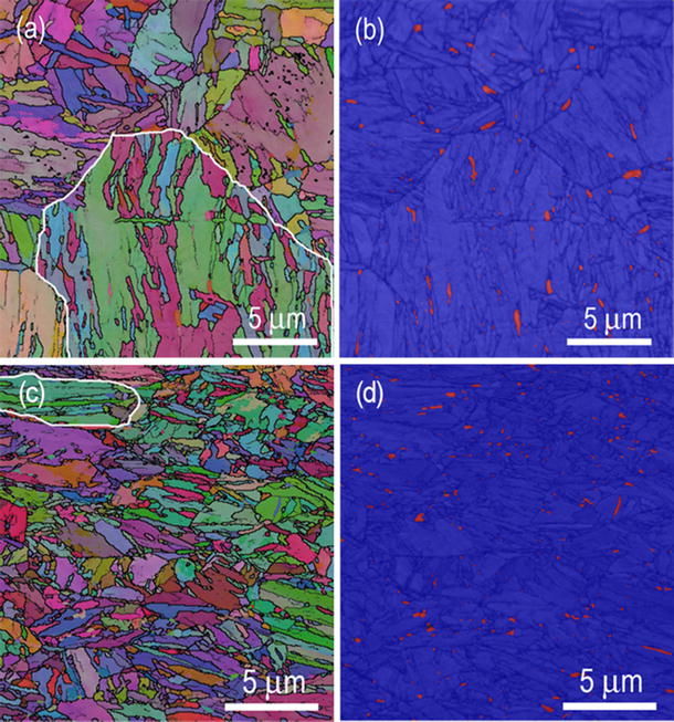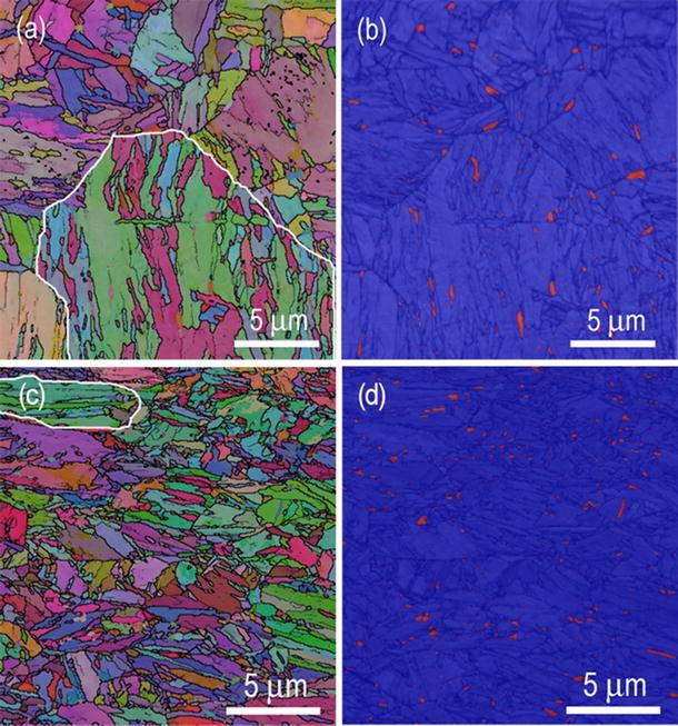 Fig. 2 Orientation imaging maps of low-carbon a, b and medium-carbon c, d steels after Q-P-T process. Martensite and retained austenite are simultaneously shown in a, c, while only retained austenite is shown in b, d as red. The white line indicates the prior austenite grain boundaries
