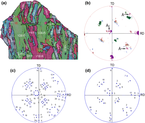 Figure 3a shows an OIM of lath martensite and retained austenite structure in a limited area enclosed by the white line in Fig. 2a. The martensite variants are accurately analyzed in each block to identify the prior austenite grain boundaries. It is clear that all 24 variants do not necessarily appear within one austenite grain [11]. Numerous blocks are composed of a specific combination of two variants with a small misorientation, i.e., V1-V4, V2-V5, and V3-V6, but some blocks with only one variant which has been marked as red (V5, V14, V16, V21, and V23). Figure 3b shows experimental {001}bcc pole figure of the lath martensite and retained austenite corresponding to Fig. 3a. Even though this PAG is probably not complete on the mapping, the pole figure inside the PAG could also be studied in detailed for determination of the OR between the martensite and austenite. It can be seen that experimental points present a large scatter, which could be attributed to the intra-block misorientation [27]. Figure 3c, d shows the K-S and N-W ORs simulated from {001}bcc pole figure, respectively. Comparing Fig. 3b with Fig. 3c, d, the simulated K-S and N-W ORs do not well coincide with the experimental pole figure. The reason may be the orientation spread from the ideal variant orientations and high symmetrical low-index directions.