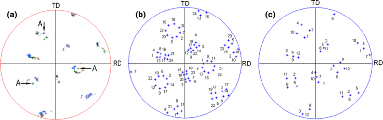 Similar OR analyses are carried out for the medium-carbon steel after Q-P-T process. Figure 4a shows experimental {001}bcc pole figure obtained experimentally for the region of a PAG enclosed by the white line in Fig. 2c. Figure 4b, c shows the K-S and N-W ORs simulated from {001}bcc pole figure, respectively. It can be seen from Fig. 4 that the simulated K-S and N-W ORs also do not well coincide with the experimental {001}bcc pole figure.