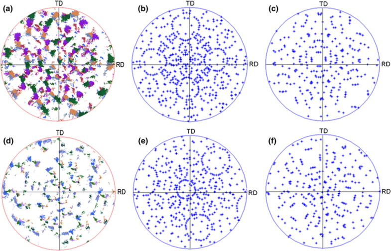Fig. 5 Experimental {123}bcc pole figures of the lath martensite and retained austenite in low-carbon a-c and medium-carbon d-f steels after Q-P-T process. a, d Are patterns measured, while b, e K-S, c, f N-W ORs simulated from {123}bccpole figures, respectively