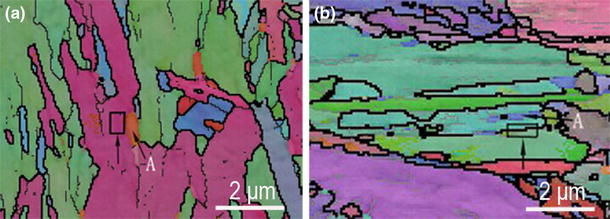For demonstrating the method developed by Miyamoto et al., two low- and medium-carbon Q-P-T steels with significant amount of retained austenite were used for the OR measurement in this study. Figure 6 shows the partial magnification OIM of Fig. 2a, c, the area of black rectangles adjacent to the retained austenite is selected for analysis and the symbol A denotes the retained austenite.