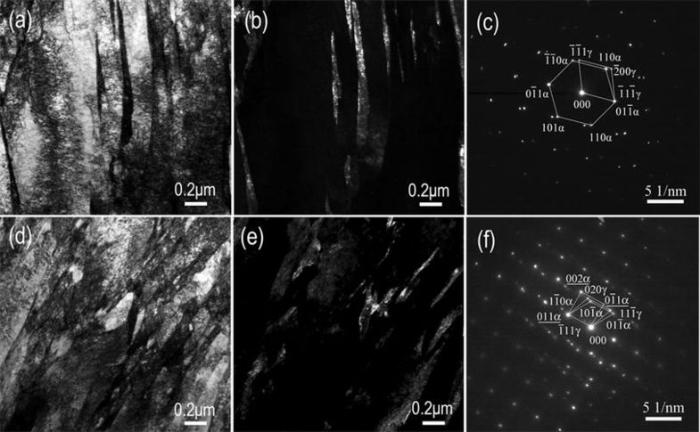Fig. 1 TEM images show the martensite and retained austenite in the Q-P-T samples: a bright field image of the retained austenite in low-carbon steel; b dark field image of the retained austenite in low-carbon steel; c SAED pattern from low-carbon steel; d bright field image of the medium-carbon steel; e dark field image of the retained austenite of the medium-carbon steel; f SAED pattern from the medium-carbon steel