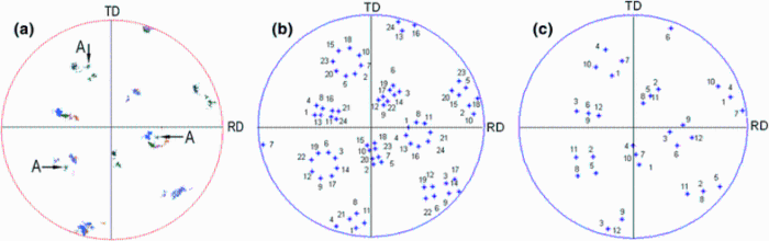 Finally, \(M^{\text{fcc}}\) and \(V^{f \to b}\) are determined as \(\Delta \theta_{\text{average}}\) becomes minimal by numerical fitting for all the measured N data points. Miyamoto et al. [21] indicated that the calculated errors of \(M^{\text{fcc}}\)and \(V^{f \to b}\) are less than 1° for the OR obtained by fitting in the present method which agree with the mean OR of martensite laths formed from a single austenite grain.