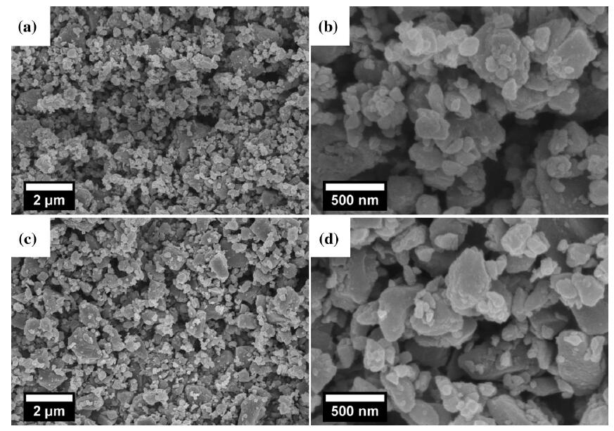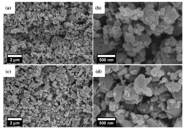 Fig. 1 Low magnification a, c and high magnification b, d SEM images of the Sb/C micro-/nanohybrid a, b, pure carbon c, d.