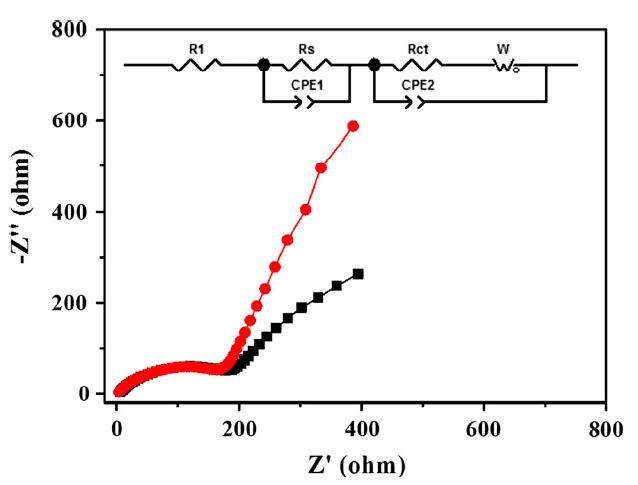 Fig. 10 Electrochemical impedance spectra of the Sb/C micro-/nanohybrid (red) and pure carbon (black) .