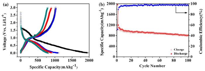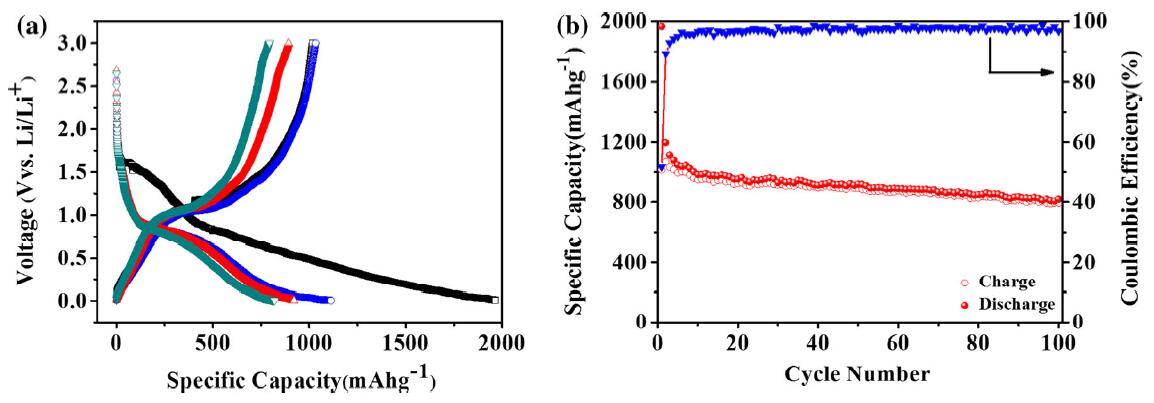 Fig. 11 Galvanostatic discharge-charge curves a and cycling performance b of the Sb/C micro-/nanohybrid electrode with a mass loading density of 0.14 mg cm-2 at the current density of 66 mA g-1. The curves with the black, blue, red, and dark cyan color in image are referred to the 1st, 2nd, 50th, and 100th cycles, respectively.