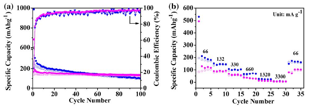 Fig. 12 Cycling performance at the current density of 66 mA g-1 a and rate performance b of the pure carbon (magenta) and Sb/C micro-/nanohybrid (blue) as NIB anodes. Hollow circle: charge process, solid circle: discharge process.
