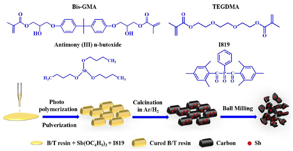 Antimony(III) n-butoxide (Alfa Aesar Co., Ltd., China), bisphenol A glycidyl dimethacrylate (Bis-GMA, Reagent Grade, Aladdin Reagent Co., Ltd., China), triethylene glycol dimethacrylate (TEGDMA, 95%, Aladdin Reagent Co., Ltd., China), phenyl bis (2, 4, 6-trimethyl benzoyl)-phosphine oxide (Irgacure I819, Sigma-Aldrich), conductive carbon super P (SCM Chem. Shanghai, China), poly (vinylidene fluoride) (PVDF, Solvay), and antimony powder (Aladdin Reagent Co., Ltd., Shanghai, China) were all used as received without further purification.