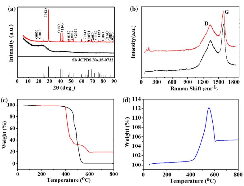 Fig. 4 XRD a, Raman b, TGA c profiles of the Sb/C micro-/nanohybrid (red) and pure carbon (black), TGA d profile of commercial antimony powders.