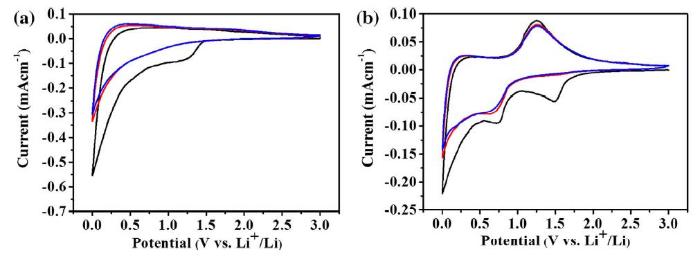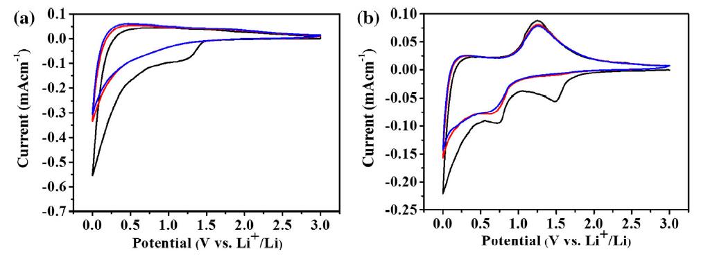 Fig. 7 Cyclic voltammetry profiles of the pure carbon a and Sb/C micro-/nanohybrid b. The curves with black, red, and blue colors refer to the 1st, 2nd, and 3rd cycle, respectively.