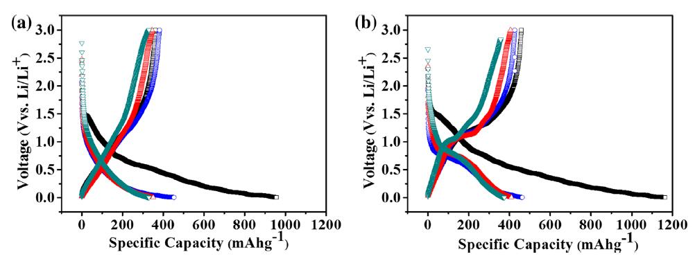 Fig. 8 Galvanostatic discharge/charge curves of the pure carbon a and Sb/C micro-/nanohybrid b. The 1st, 2nd, 50th, and 200th cycles are displayed by the black, blue, red, and cyan curves, respectively.