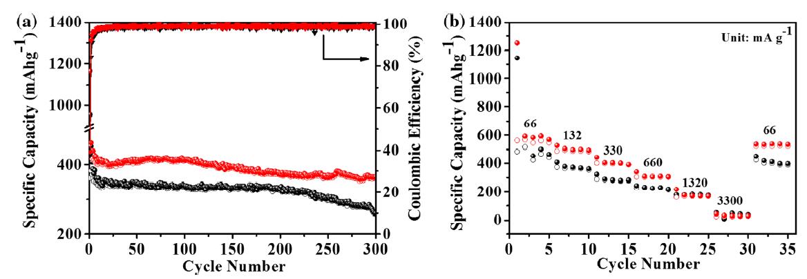 Fig. 9 Cycling performance at the current density of 66 mA g-1 a and rate performance b of the pure carbon (black) and Sb/C micro-/nanohybrid (red), hollow circle represents charge process and solid circle represents discharge process.